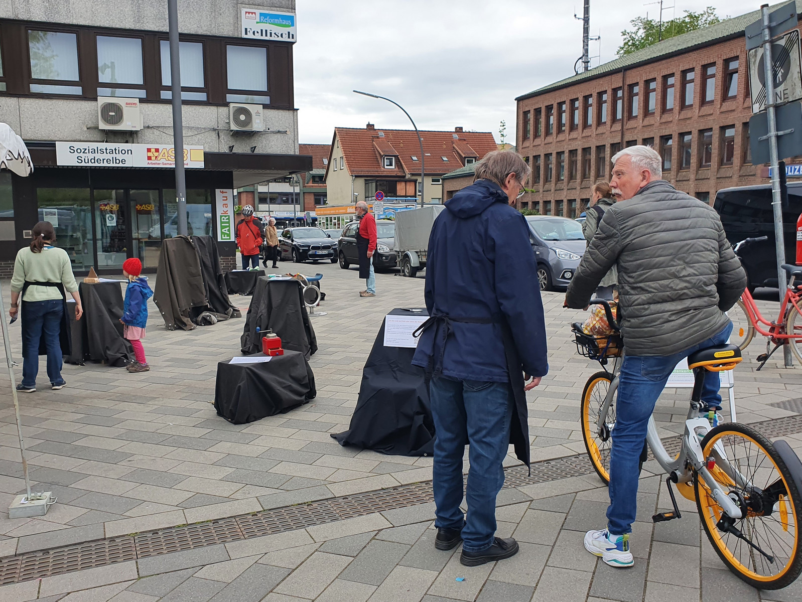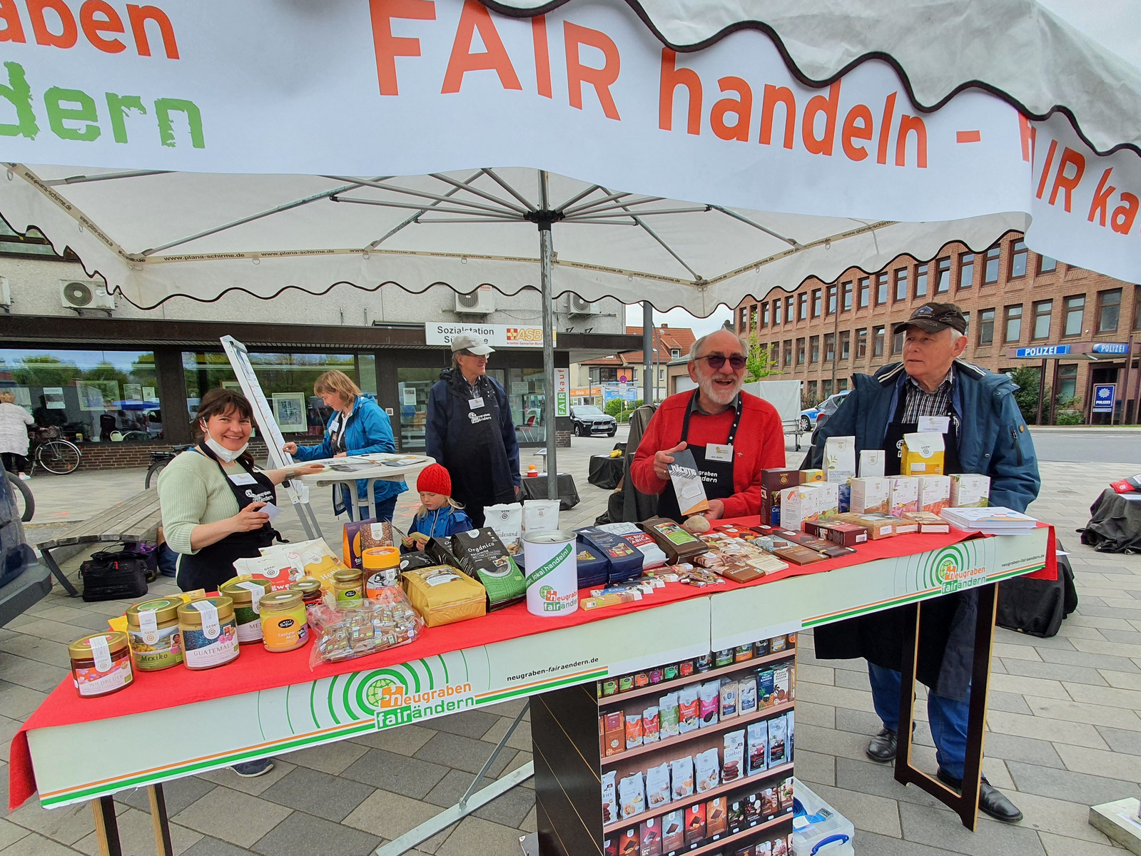 Um 9:00 Uhr versammelte sich unser Team auf dem Neugrabener Markt und begann mit dem zeitraubenden Aufbau unserer Aktion MÄCHTIG unfair. Bundesweit zeigen hunderte Weltläden in diesen Tagen die negativen Auswirkungen niedriger Erzeuger-Preise auf und fordern, dass die Gewinne entlang globaler Lieferketten gerechter verteilt werden müssen