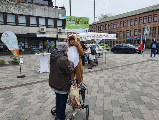 Unser Anliegen am Ostersamstag: Wir wollten darauf aufmerksam machen, dass im Kakaoanbau Pestizide eingesetzt werden, die in der EU verboten sind. Nicht nur die Gesundheit der Kakaobäuerinnen und -bauern und das Ökosystem werden gefährdet, auch in der Schokolade, die bei uns in den Handel kommt, konnten vereinzelt Pestizidrückstände nachgewiesen werden.