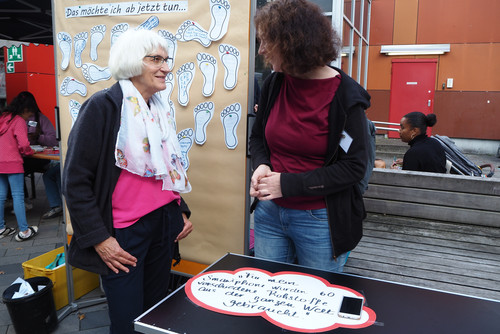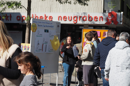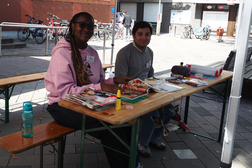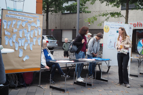 An unseren Info- und Aktionstischen vor dem großen Wandbild zum Nachhaltigkeitsziel 12 an der Hauswand wurden viele Gespräche geführt und die Infotafeln erläutert.