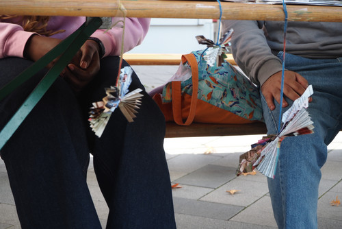 Für die Kinder war ein Basteltisch hergerichtet, an dem unter Anleitung von STUBE-Mitarbeitenden Schmetterlinge aus alten Illustrierten hergestellt wurden.